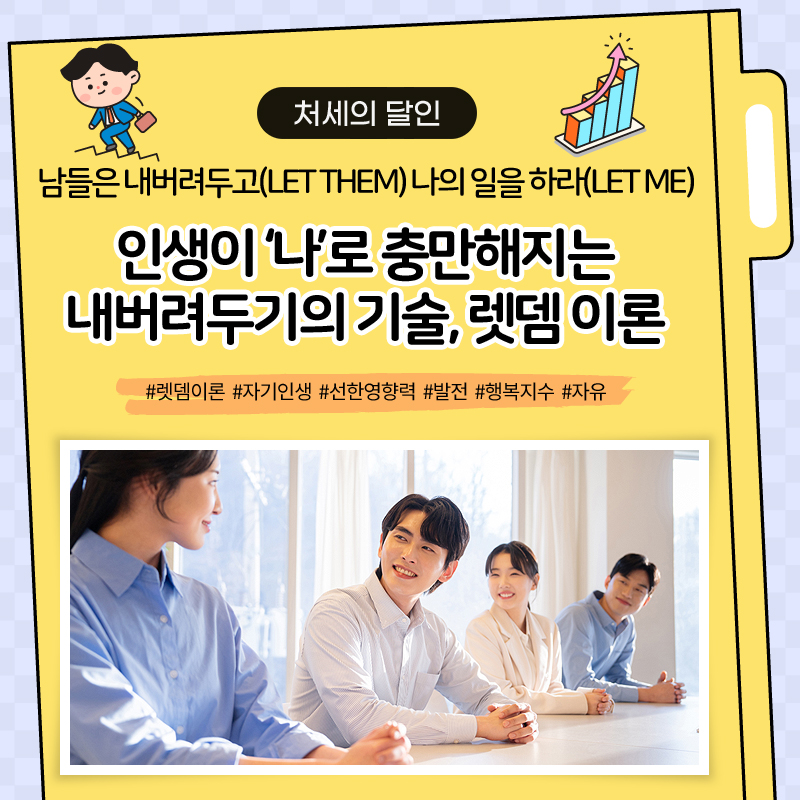 인생은 결국 자신이 주인공이 되어 스스로 방향을 잡고 굳세게 걸어가야 한다는 것을 알면서도 타인으로 인해 번번이 무의미한 노력과 헛발질을 반복하게 됩니다. 렛뎀 이론은 직장 동료가 뒤에서 내 이야기를 해도, 친구들이 나만 빼고 즐거운 시간을 보내도, 부모의 기대에 미치지 못해 실망시켜도 내버려두자(LET THEM)는 이론입니다.