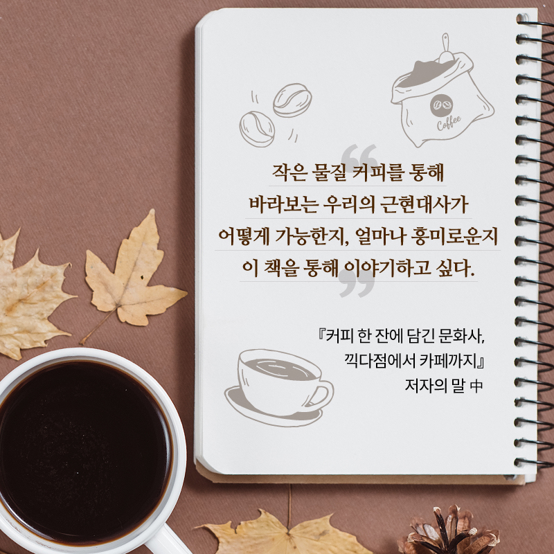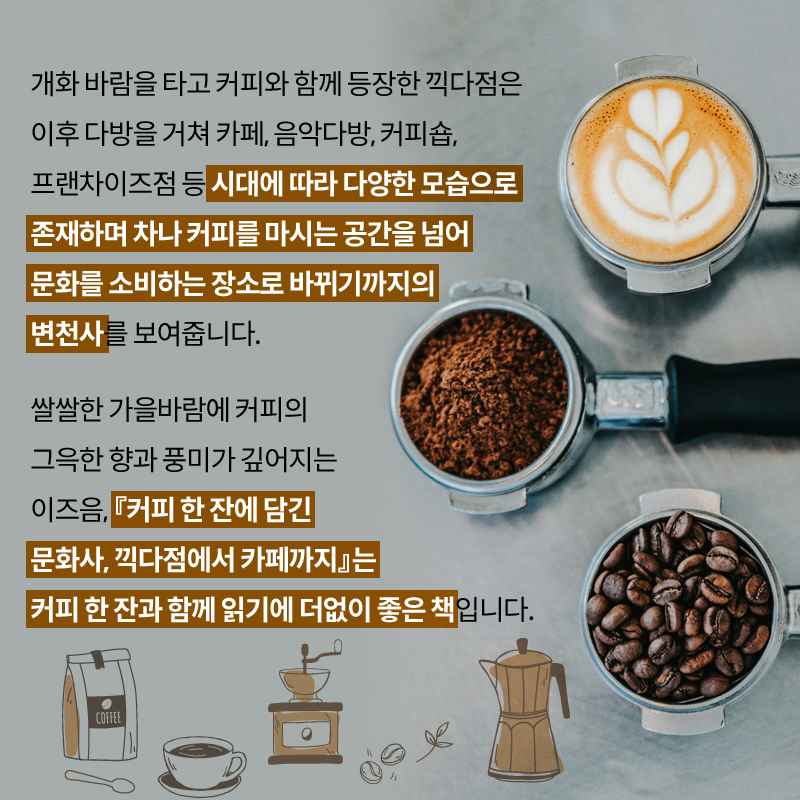 개화 바람을 타고 커피와 함께 등장한 끽다점은 이후 다방을 거쳐 카페, 음악다방, 커피숍, 프랜차이즈점 등 시대에 따라 다양한 모습으로 존재하며 차나 커피를 마시는 공간을 넘어 문화를 소비하는 장소로 바뀌기까지의 변천사를 보여줍니다. 쌀쌀한 가을바람에 커피의 그윽한 향과 풍미가 깊어지는 이즈음, 「커피 한 잔에 담긴 문화사, 끽다점에서 카페까지」는 커피 한 잔과 함께 읽기에 더없이 좋은 책입니다.