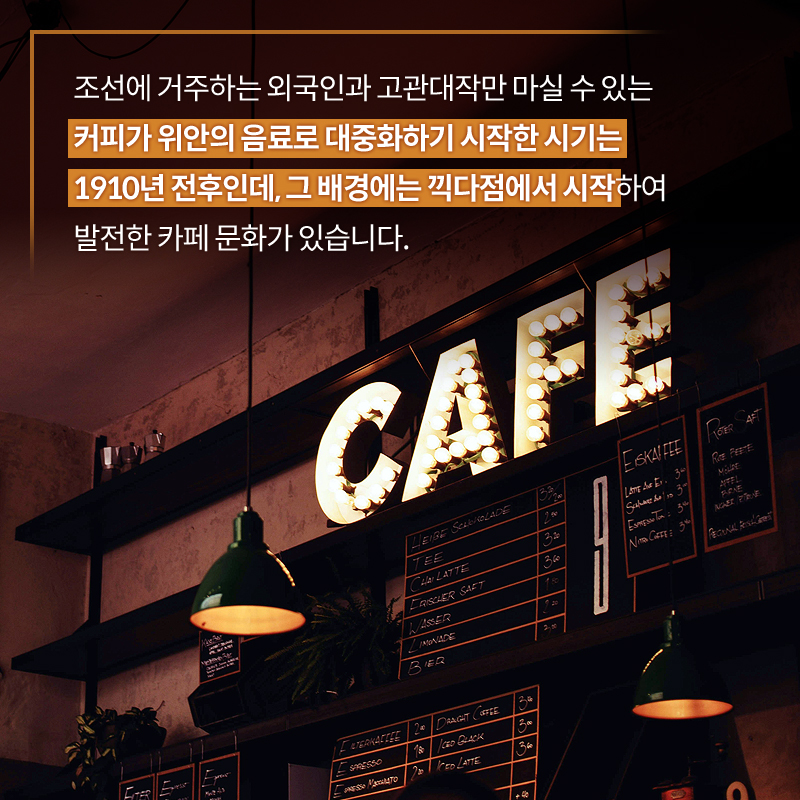조선에 거주하는 외국인과 고관대작만 마실 수 있는 커피가 위안의 음료로 대중화하기 시작한 시기는 1910년 전후인데, 그 배경에는 끽다점에서 시작하여 발전한 카페 문화가 있습니다.