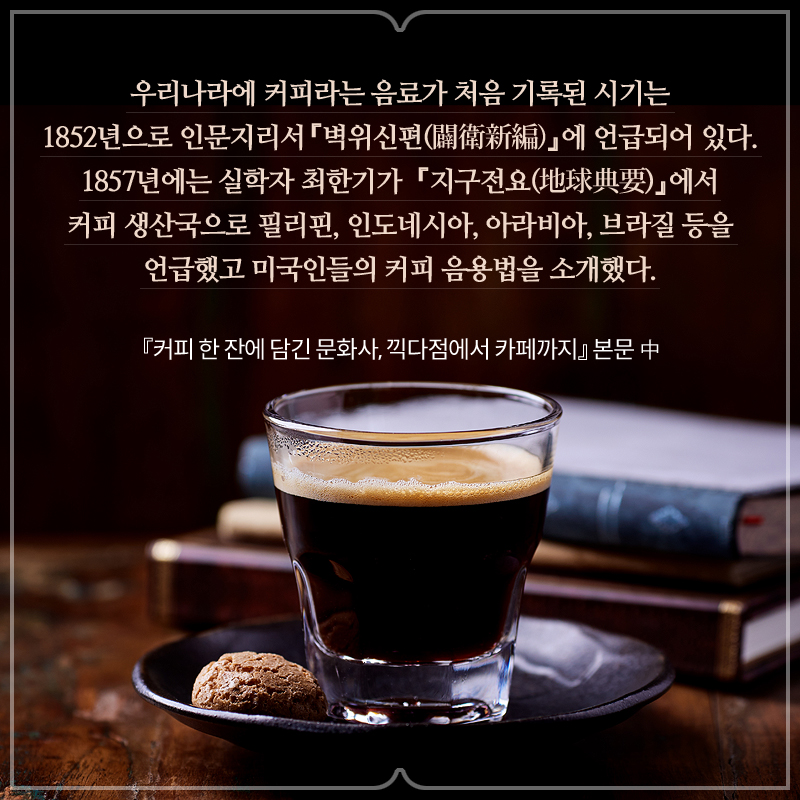 우리나라에 커피라는 음료가 처음 기록된 시기는 1852년으로 인문지리서 「벽위신편(闢衛新編)」에 언급되어 있다. 1857년에는 실학자 최한기가 「지구전요(地球典要)」에서 커피 생산국으로 필리핀, 인도네시아, 아라비아, 브라질 등을 언급했고 미국인들의 커피 음용법을 소개했다.
