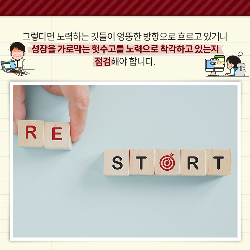 그렇다면 노력하는 것들이 엉뚱한 방향으로 흐르고 있거나 성장을 가로막는 헛수고를 노력으로 착각하고 있는지 점검해야 합니다.