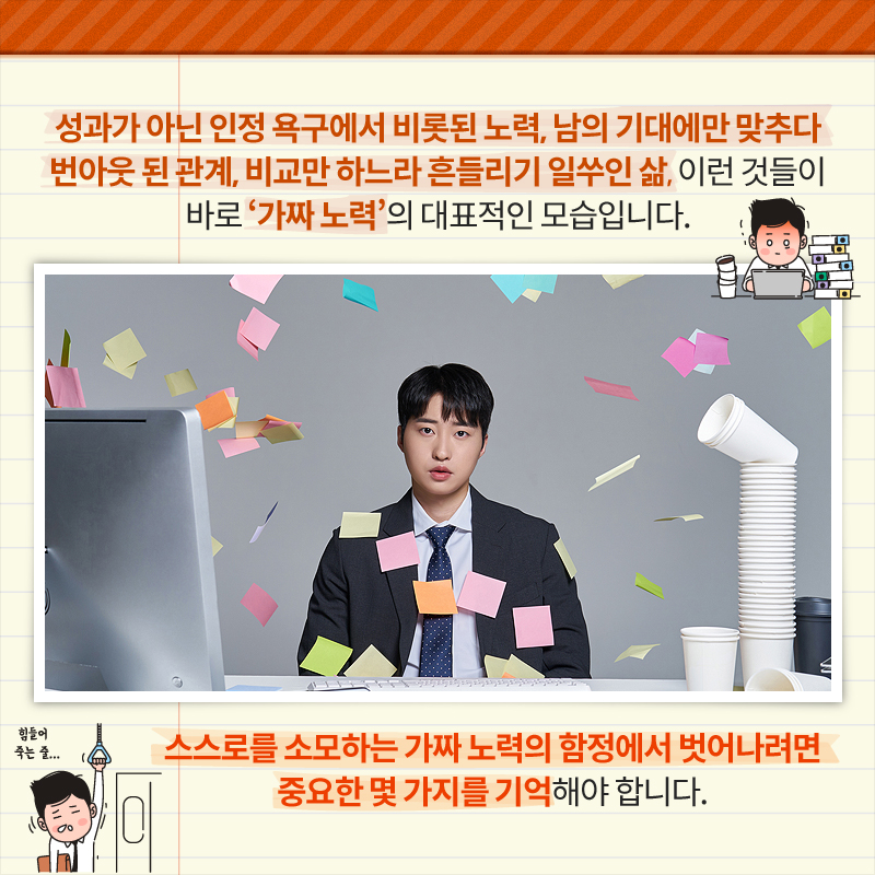 스스로를 소모하는 가짜 노력의 함정에서 벗어나려면 중요한 몇 가지를 기억해야 합니다.