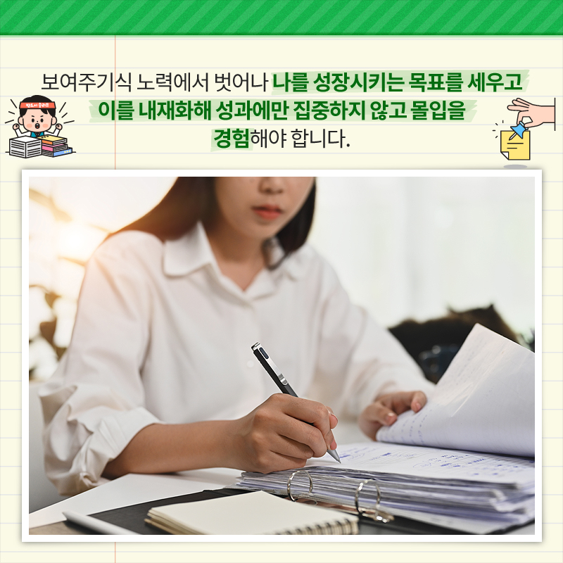 보여주기식 노력에서 벗어나 나를 성장시키는 목표를 세우고 이를 내재화해 성과에만 집중하지 않고 몰입을 경험해야 합니다.