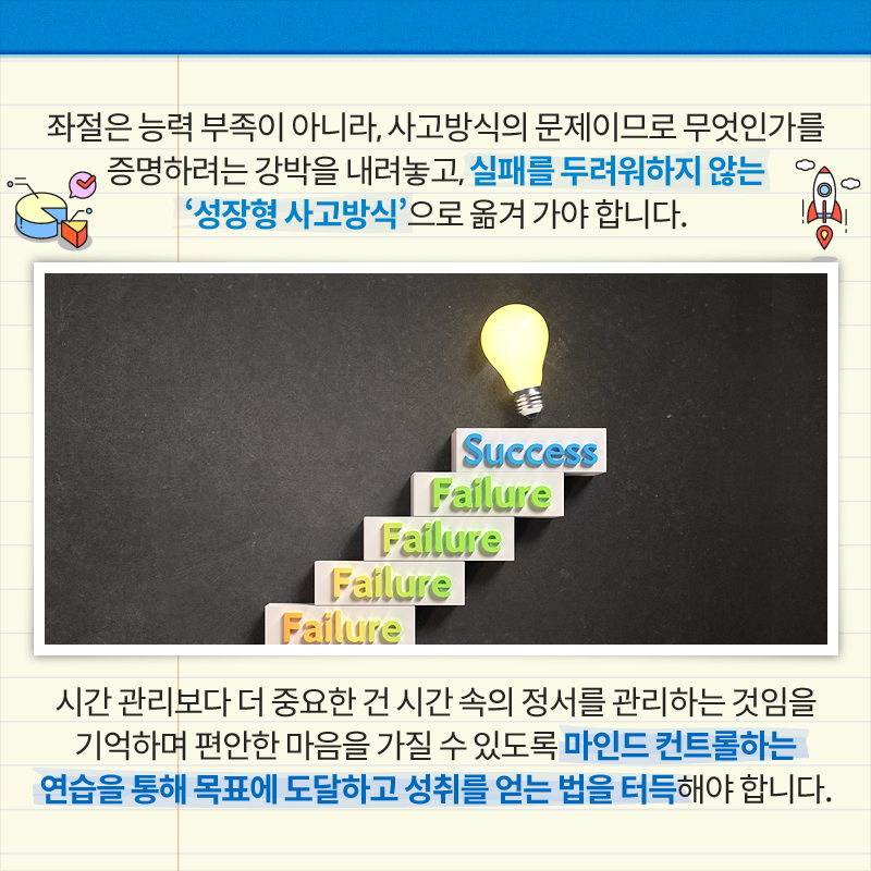 좌절은 능력 부족이 아니라, 사고방식의 문제이므로 무엇인가를 증명하려는 강박을 내려놓고, 실패를 두려워하지 않는 '성장형 사고방식'으로 옮겨 가야 합니다.
