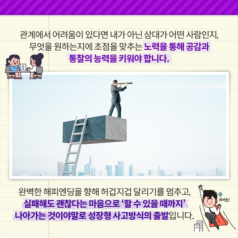 관계에서 어려움이 있다면 내가 아닌 상대가 어떤 사람인지, 무엇을 원하는지에 초점을 맞추는 노력을 통해 공감과 통찰의 능력을 키워야 합니다.