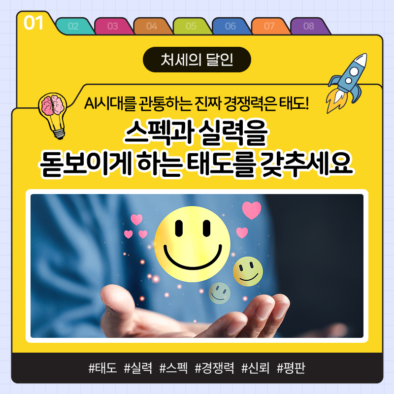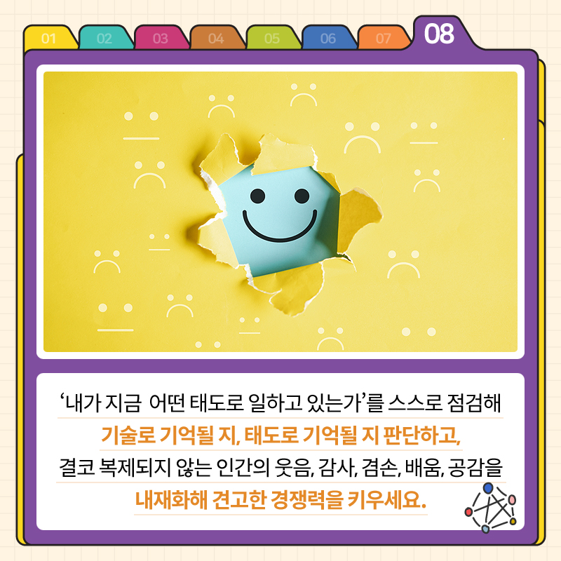 '내가 지금 어떤 태도로 일하고 있는가'를 스스로 점검해 기술로 기억될 지, 태도로 기억될 지 판단하고, 결코 복제되지 않는 인간의 웃음, 감사, 겸손, 배움, 공감을 내재화해 견고한 경쟁력을 키우세요.