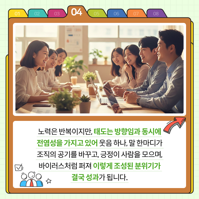 노력은 반복이지만, 태도는 방향임과 동시에 전염성을 가지고 있어 웃음 하나, 말 한마디가 조직의 공기를 바꾸고, 긍정이 사람을 모으며, 바이러스처럼 퍼져 이렇게 조성된 분위기가 결국 성과가 됩니다.