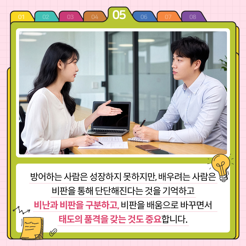 방어하는 사람은 성장하지 못하지만, 배우려는 사람은 비판을 통해 단단해진다는 것을 기억하고 비난과 비판을 구분하고, 비판을 배움으로 바꾸면서 태도의 품격을 갖는 것도 중요합니다.