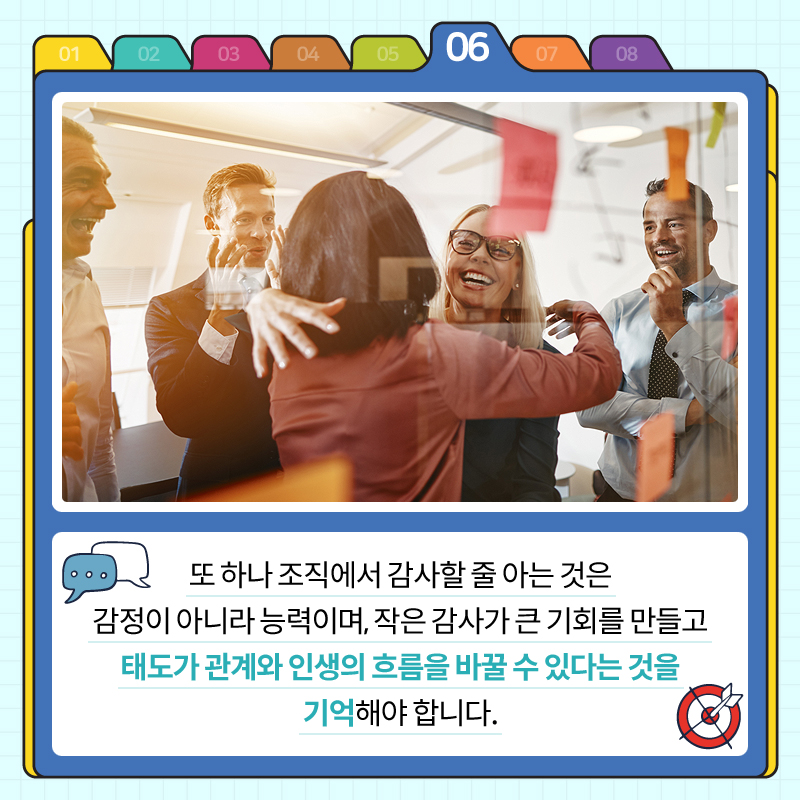 또 하나 조직에서 감사할 줄 아는 것은 감정이 아니라 능력이며, 작은 감사가 큰 기회를 만들고 태도가 관계와 인생의 흐름을 바꿀 수 있다는 것을 기억해야 합니다.
