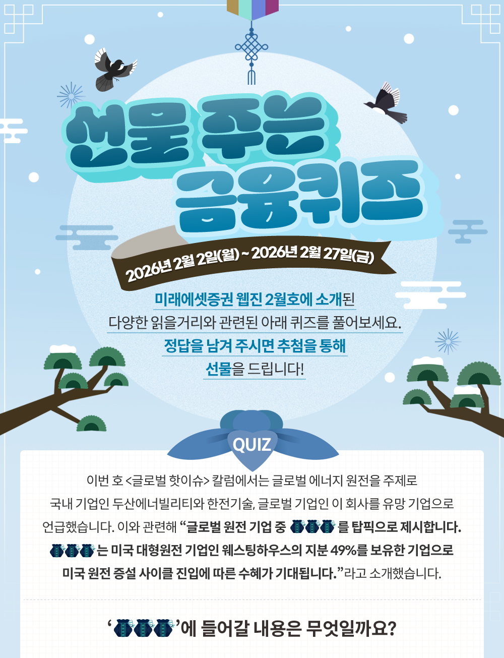 미래에셋증권웹진 2월호에 소개된 다양한 읽을거리와 관련된 아래 퀴즈를 풀어보세요.
