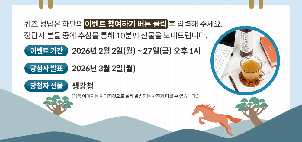 - 당첨자 선물: 생강청 (상품 이미지는 이미지컷으로 실제 발송되는 사진과 다를 수 있습니다.)
