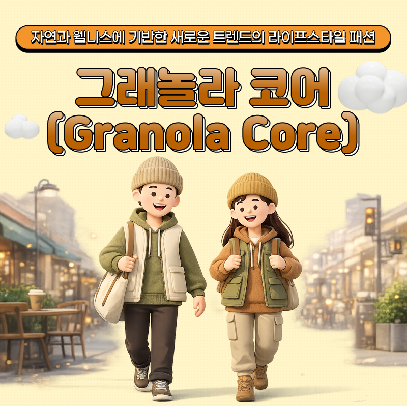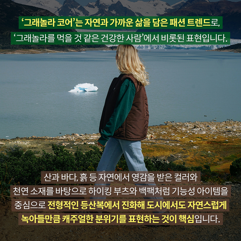 '그래놀라 코어'는 자연과 가까운 삶을 담은 패션 트렌드로, '그래놀라를 먹을 것 같은 건강한 사람'에서 비롯된 표현입니다.