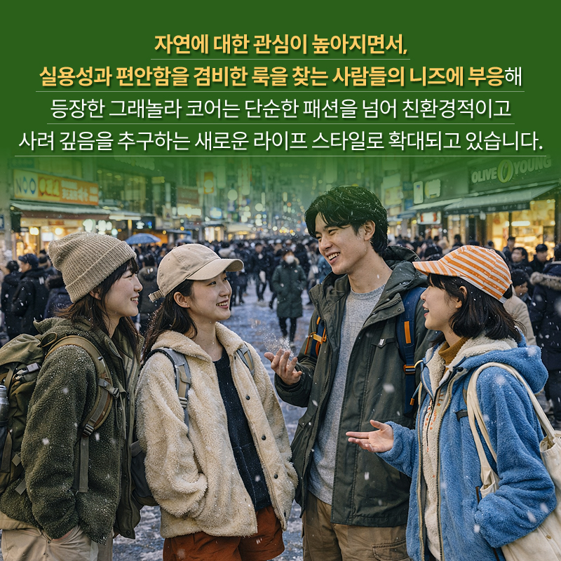 자연에 대한 관심이 높아지면서, 실용성과 편안함을 겸비한 룩을 찾는 사람들의 니즈에 부응해 등장한 그래놀라 코어는 단순한 패션을 넘어 친환경적이고 사려 깊음을 추구하는 새로운 라이프 스타일로 확대되고 있습니다.