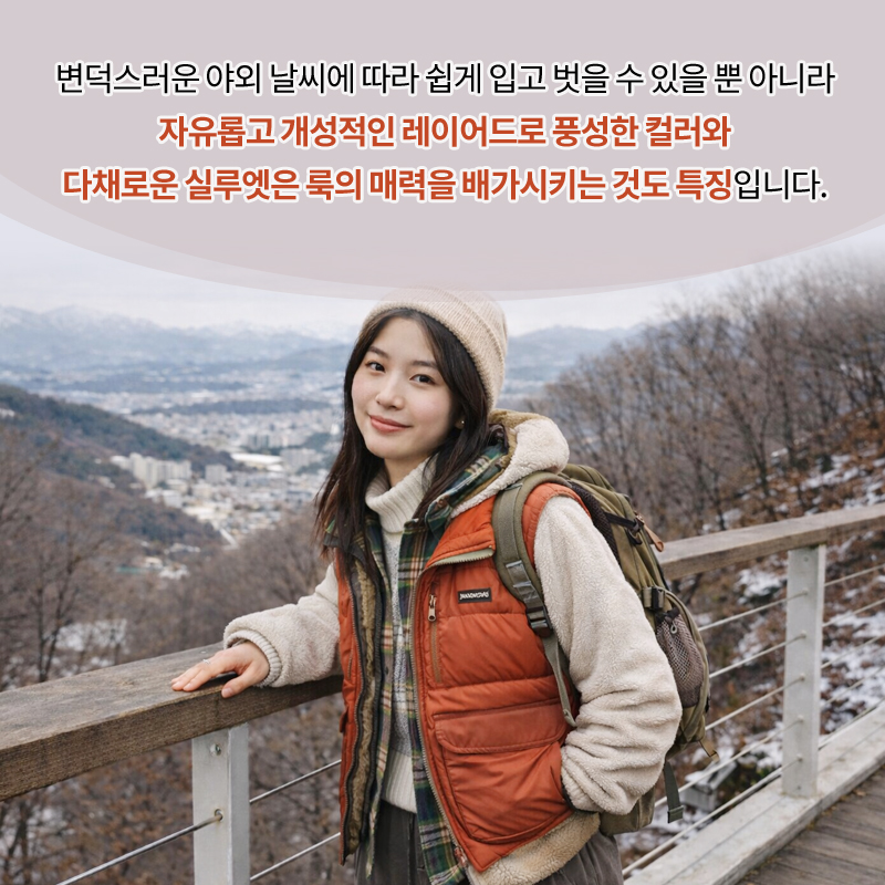변덕스러운 야외 날씨에 따라 쉽게 입고 벗을 수 있을 뿐 아니라 자유롭고 개성적인 레이어드로 풍성한 컬러와 다채로운 실루엣은 룩의 매력을 배가시키는 것도 특징입니다.