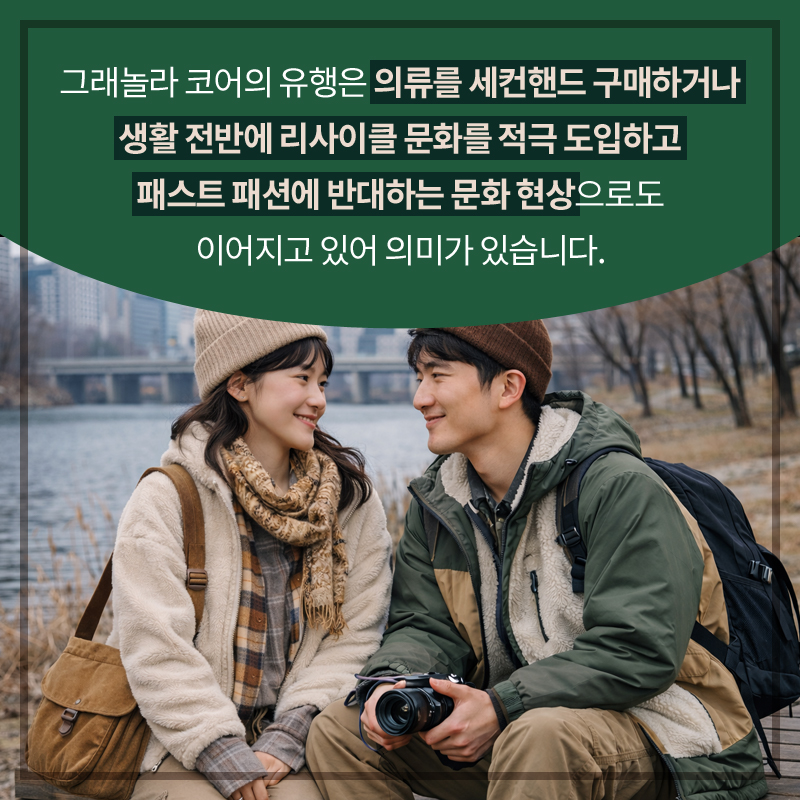 그래놀라 코어의 유행은 의류를 세컨핸드 구매하거나 생활 전반에 리사이클 문화를 적극 도입하고 패스트 패션에 반대하는 문화 현상으로도 이어지고 있어 의미가 있습니다.