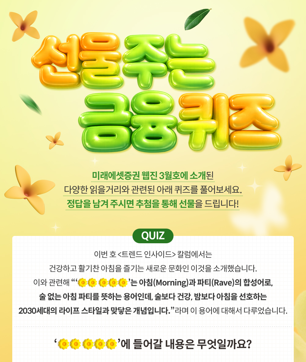미래에셋증권웹진 3월호에 소개된 다양한 읽을거리와 관련된 아래 퀴즈를 풀어보세요.