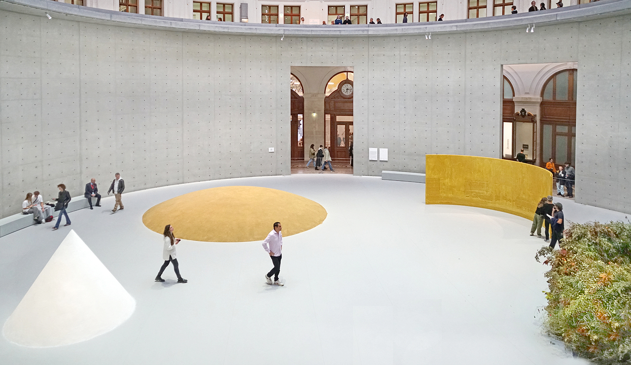 고풍스러운 돔형 천장이 인상적인 파리 상업 거래소 부르스 드 코메르스는 최고의 미술 컬렉터와 건축가가 만나 새롭게 탄생했다. 프랑수아 피노가 수집한 5천여 점의 미술품을 전시할 공간을 세계적인 건축가인 안도 다다오가 완벽하게 리노베이션 한 것이다. 1767년 처음 세워진 이래, 곡물거래소이자 증권거래소였던 이 건물은 오랜 시간 철거되지 않은 채 도심 한가운데 남아 있었다. 그러다 2021년, 마침내 18세기에 지어진 프랑스의 대표적인 건축물은 대형 노출 콘크리트 실린더를 품은 원형의 전시공간으로 변신했다. 건물의 기존 구조를 존중하면서도 현대미술에 알맞은 새로운 전시공간을 창조하고자 고심한 끝에 돔형태의 지붕과 원형 구조를 살려 자연광을 내부로 끌어들였다. 여기에 이중 유리를 설치해 내부의 빛과 온도를 조절할 수 있도록 정밀하게 조절할 수 있도록 설계한 것이다. 이곳이 바로 미술관의 성지 파리에서도 핫플로 손꼽히는 피노 컬렉션 미술관(Bourse de Commerce - Pinault Collection)이다. 피노 컬렉션 미술관의 상징처럼 된 이 실린더와 원형 돔은 전시의 매력을 최대치로 끌어올리는 효과를 발휘한다. 실린더 구조물로 인해 대형 작품을 전시할 수 있는 벽면을 확보하고, 다양한 퍼포먼스를 보여줄 수 있는 중앙공간이 만들어졌으며, 이 건축물의 하이라이트라고 할 수 있는 천장 프레스코화를 보다 가까이에서 감상할 수 있는 중앙통로까지 완성되었다. 그야말로 마에스트로의 경지에 이른 건축가 안도 다다오의 신의 한수가 아닐 수 없다. 지금 피노 컬렉션 미술관에는 프랑수아 피노가 수십 년에 걸쳐 수집해 온 현대미술 작품들이 놓여 있다. 특히 내부 천장을 가득 채운 프레스코화를 복원해 오래된 과거의 공간에 현재와 미래가 교차하는 듯한 강렬한 인상을 준다.