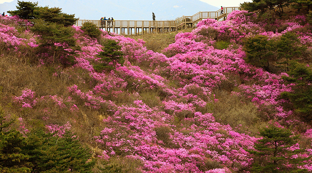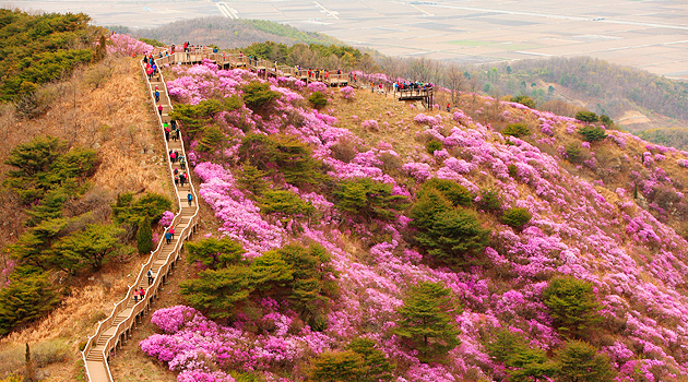 어느 코스를 선택해도 산등성이마다 진달래 군락이 황홀한 풍경을 감상할 수 있고, 초록빛 물오른 새싹과 향긋한 봄 내음이 설렘을 전하며, 곳곳에 포토존도 마련되어 있어 봄날 화사한 인생샷을 건질 수 있다.