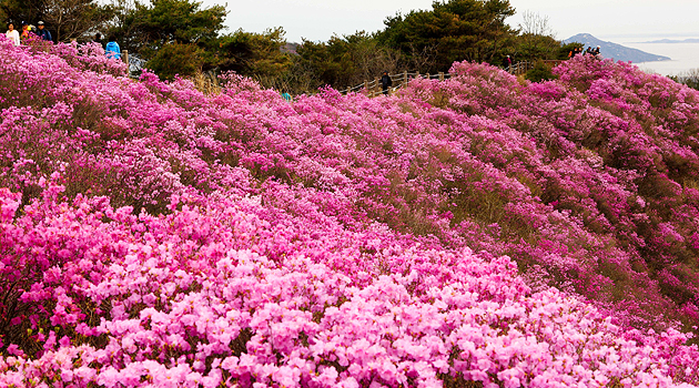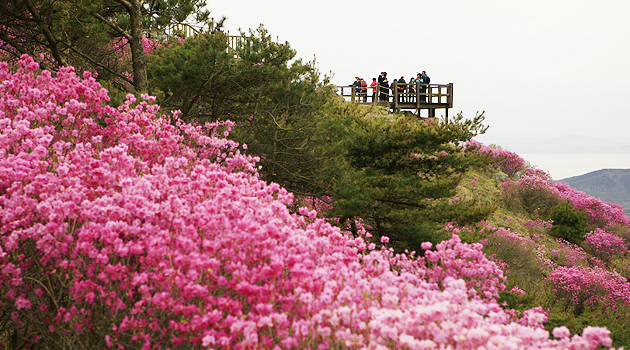 등산 도중 잠깐씩 쉬어 가며 진달래에 시선을 던지면 물감을 쏟아놓은 듯 사방이 진분홍 빛으로 채색된 풍경이 가쁜 숨을 달래어준다.
