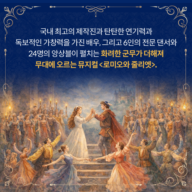 국내 최고의 제작진과 탄탄한 연기력과 독보적인 가창력을 가진 배우, 그리고 6인의 전문 댄서와 24명의 앙상블이 펼치는 화려한 군무가 더해져 무대에 오르는 뮤지컬 <로미오와 줄리엣>.