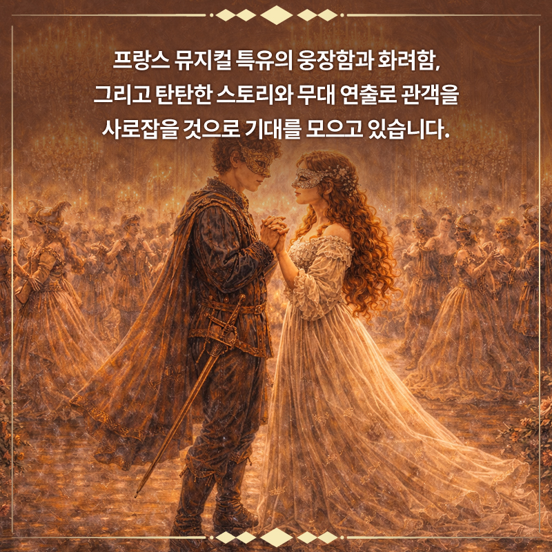 프랑스 뮤지컬 특유의 웅장함과 화려함, 그리고 탄탄한 스토리와 무대 연출로 관객을 사로잡을 것으로 기대를 모으고 있습니다.