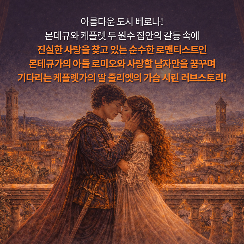 아름다운 도시 베로나! 몬테규와 케플렛 두 원수 집안의 갈등 속에 진실한 사랑을 찾고 있는 순수한 로맨티스트인 몬테규가의 아들 로미오와 사랑할 남자만을 꿈꾸며 기다리는 케플렛가의 딸 줄리엣의 가슴 시린 러브스토리!