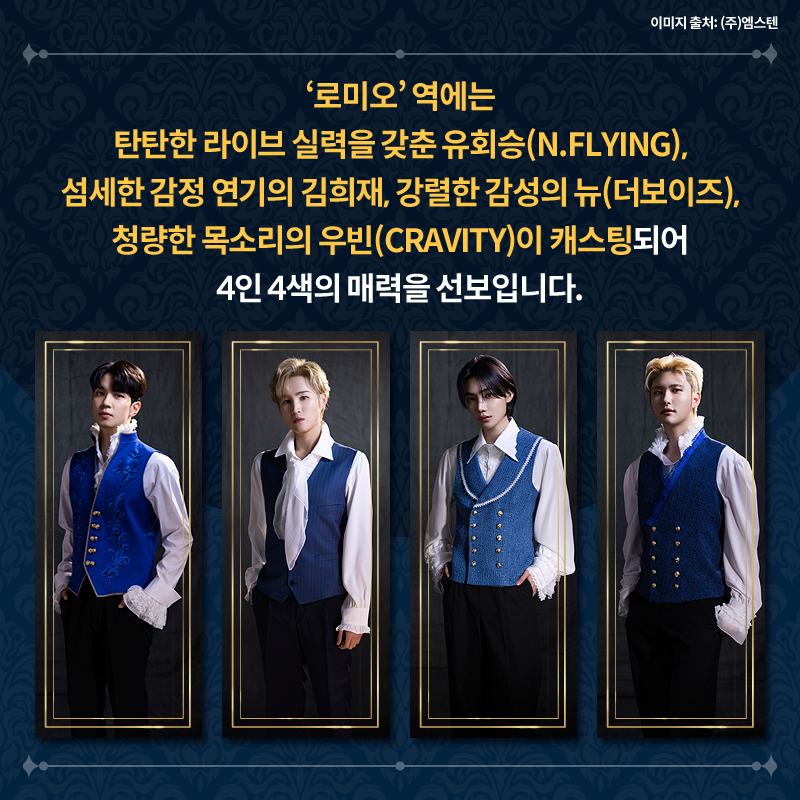 '로미오' 역에는 탄탄한 라이브 실력을 갖춘 유회승(N.FLYING), 섬세한 감정 연기의 김희재, 강렬한 감성의 뉴(더보이즈), 청량한 목소리의 우빈(CRAVITY)이 캐스팅되어 4인 4색의 매력을 선보입니다.