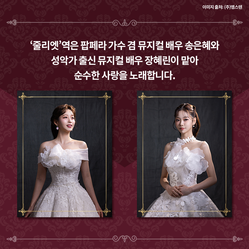 '줄리엣' 역은 팝페라 가수 겸 뮤지컬 배우 송은혜와 성악가 출신 뮤지컬 배우 장혜린이 맡아 순수한 사랑을 노래합니다.