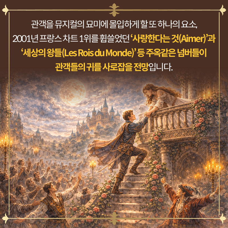 관객을 뮤지컬의 묘미에 몰입하게 할 또 하나의 요소, 2001년 프랑스 차트 1위를 휩쓸었던 '사랑한다는 것(Aimer)'과 '세상의 왕들(Les Rois du Monde)' 등 주옥같은 넘버들이 관객들의 귀를 사로잡을 전망입니다.