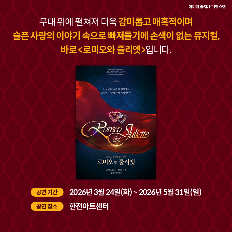 무대 위에 펼쳐져 더욱 감미롭고 매혹적이며 슬픈 사랑의 이야기 속으로 빠져들기에 손색이 없는 뮤지컬, 바로 <로미오와 줄리엣>입니다.